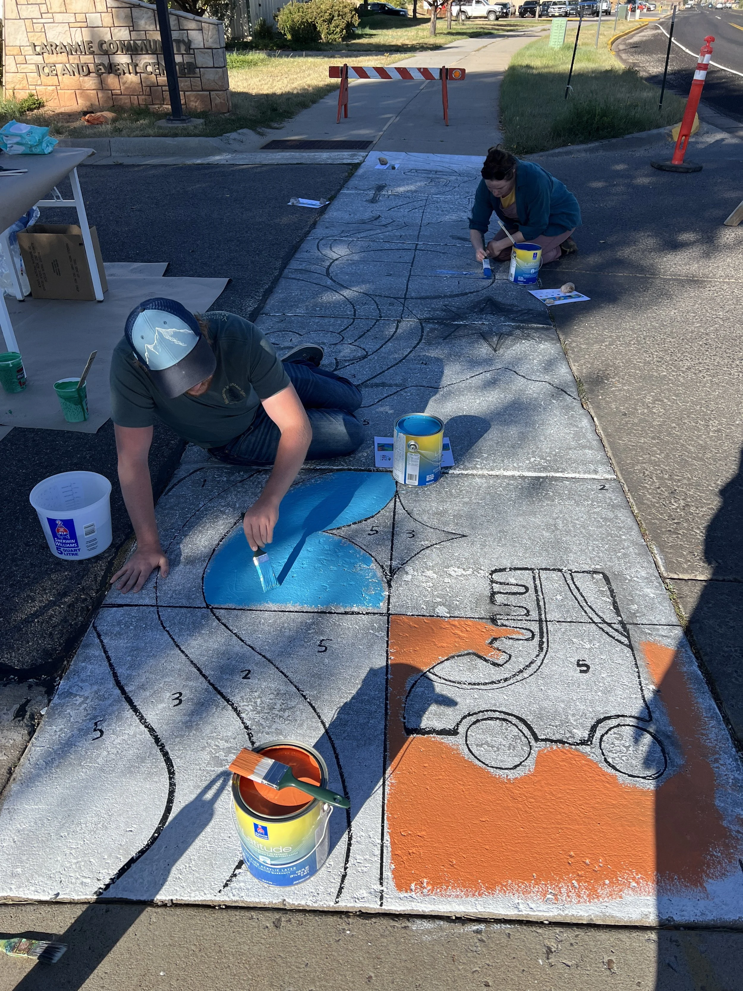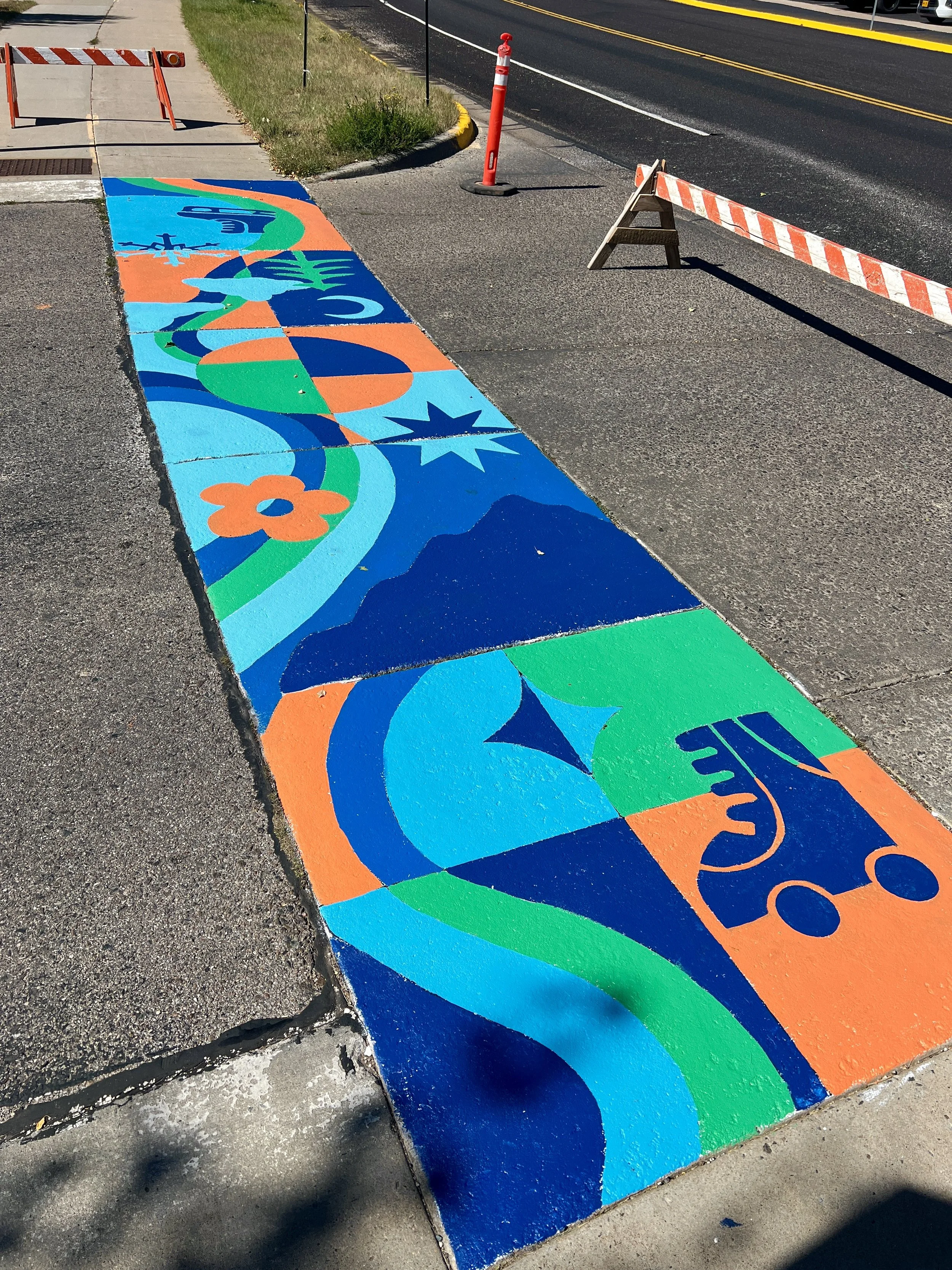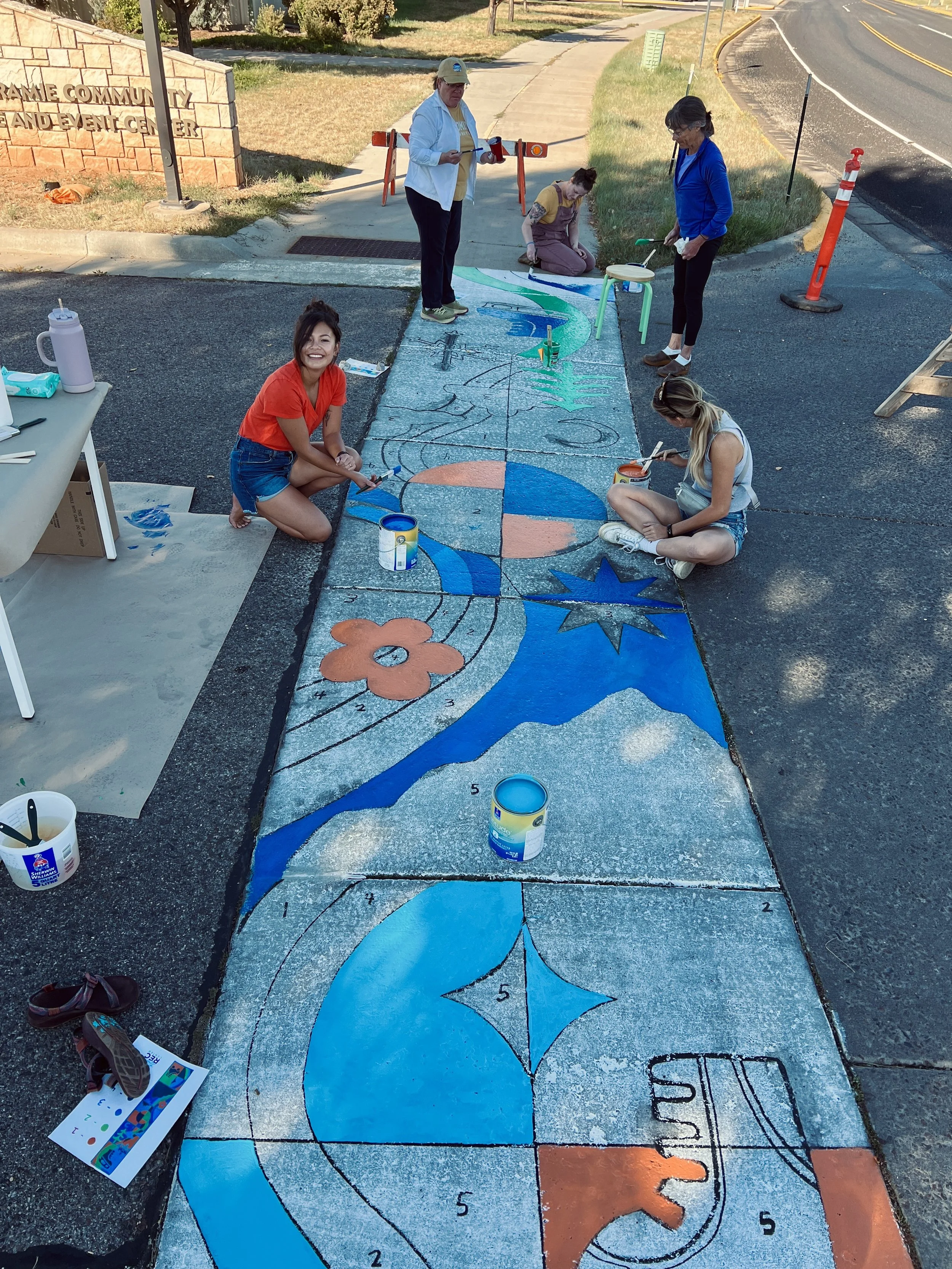 This crosswalk was part of a beautification project in Laramie. The design is based on the Rec Center’s amazing resources and the many recreation opportunities Laramie provides. Using a giant ‘paint by numbers’ approach, I sketched out the sections and labeled them by color. The community was then invited to paint with me and fill in the crosswalk. Everyone did such an amazing job!!